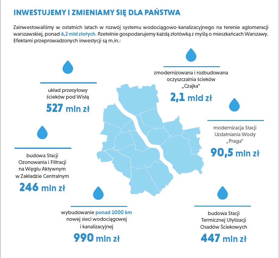 informujemy, że wniosek Spółki złożony 12 marca br. do Państwowego Gospodarstwa Wodnego Wody Polskie, w oparciu o decyzję właścicielską, o nową niższą taryfę dla zbiorowego zaopatrzenia w wodę i zbiorowego odprowadzania ścieków na terenie Warszawy i okolicznych gmin, został zatwierdzony przez Regulatora. Taka obniżka była możliwa dzięki przeprowadzonej w Spółce restrukturyzacji, pozyskanym przez nią środkom unijnym oraz gospodarnemu zarządzaniu Spółką.
